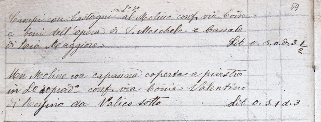 Il Molino viene poi riportato in un Terrilogio dei beni dell’Opera di San Michele di Valico Sopra, redatto dal celebre cartografo Domenico Cecchi nel 1737, dove viene disegnato al confine di un terreno di proprietà dell'Opera. azionava sul piano dei palmenti una doppia coppia di macine tramite un certo numero di ingranaggi di moltiplica collegati al suo albero.